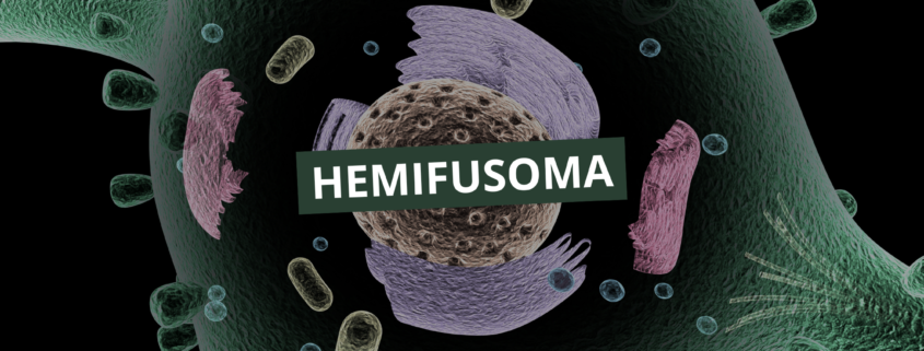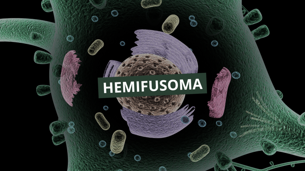 O hemifusoma é formado pela fusão parcial de duas vesículas celulares, estruturas responsáveis pelo transporte de proteínas, hormônios e outros compostos dentro da célula. Diferente de uma fusão completa, as vesículas se conectam de maneira parcial, criando uma forma que lembra um “boneco de neve com um cachecol”, onde uma vesícula maior se liga a uma menor por uma borda fina.